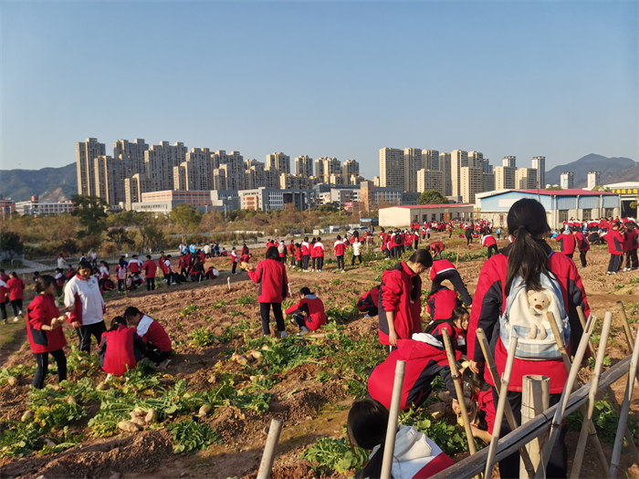 学校建成“雁勤园”、“雁行园”两个校内劳动教育实践基地,在每周一下午最后一节开设劳动教育课,每班承包一块校内劳动实践地。图为同学们在2024年12月采摘节时体验丰收的喜悦、劳动的快乐。